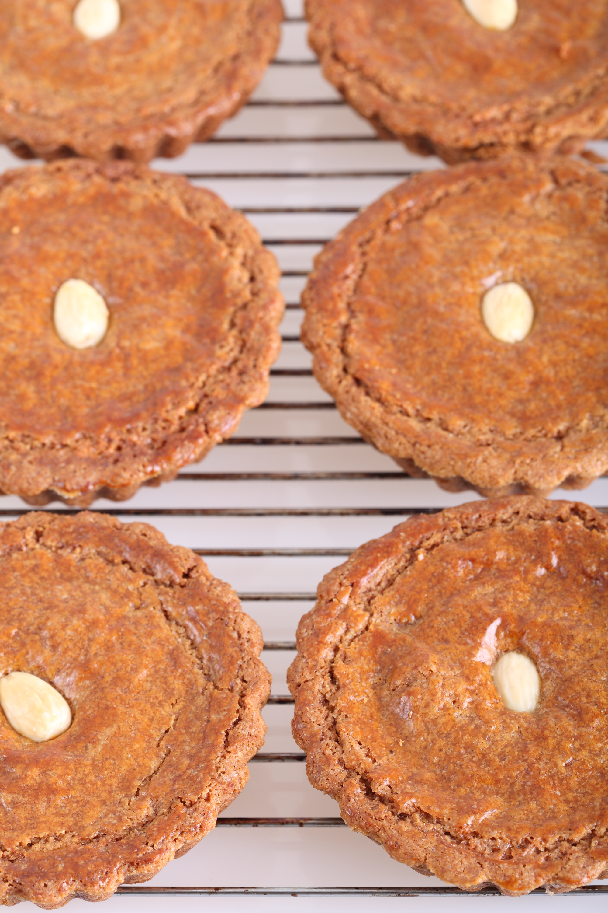 On each of the 10 base circles you put 15 grams of almond paste and press it down a bit, but make sure to leave a rim of about 1.5 cm / 0.5 inches. On top of that you place 10 g of cranberry compote. Cover the 10 circles with the other 10 circles and press the edges together with the teeth of a fork. Place them on a baking tray. Brush them with the beaten egg. Put half an almond in the middle of each pie and press down a bit. You can first put the pies in the fridge for 10 to 20 minutes to firm up a bit, but it is not absolutely necessary. Bake in the oven at 170ºC / 340ºF for about 22-24 minutes, depending on your oven. All ovens are different so you may have to vary your baking times and oven temperature to get the best result.