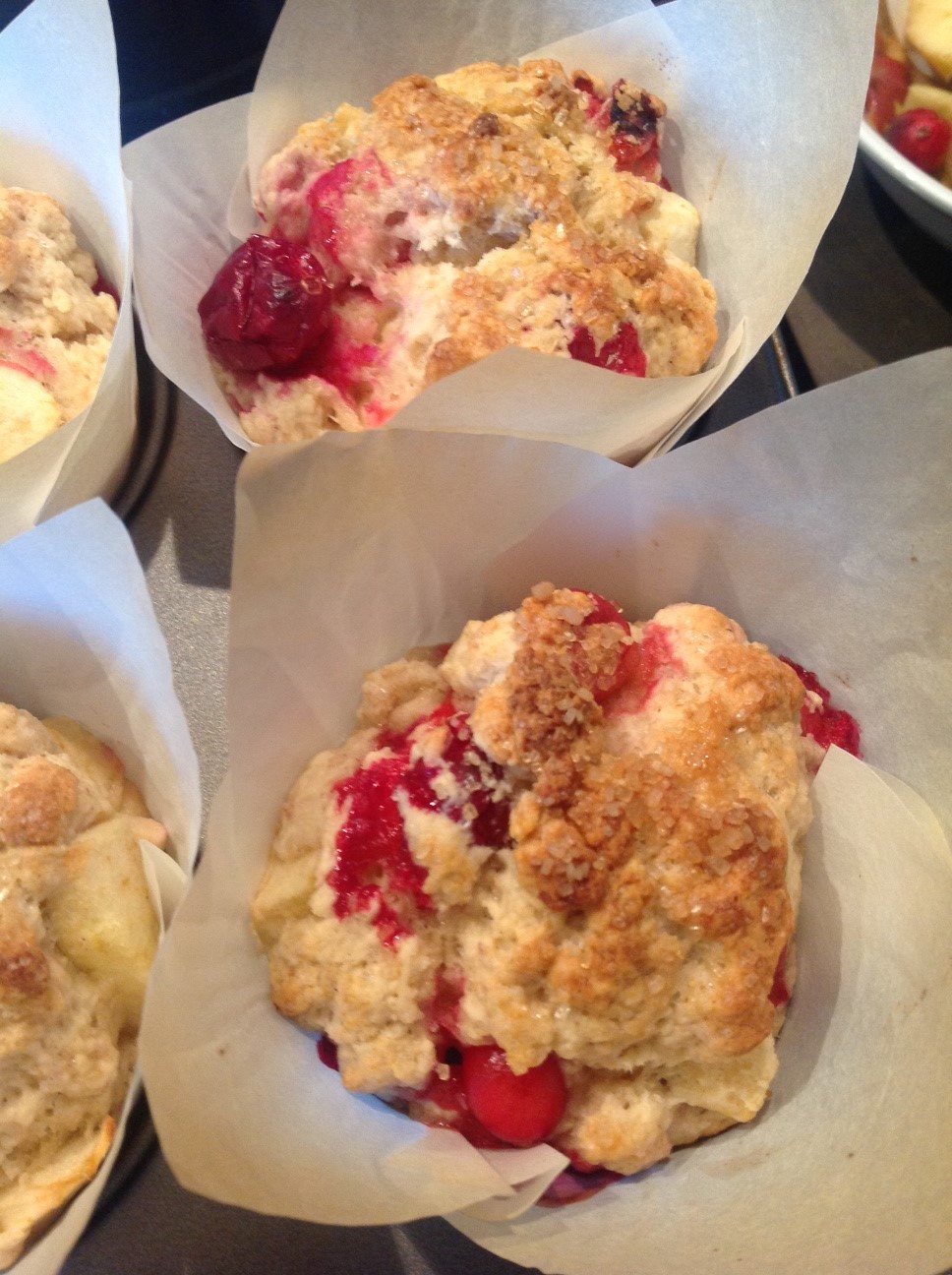 I normally bake these scones without the cranberries, nutmeg, cloves and cardamom, but I thought I’d give them the December makeover. I love the tartness of the cranberries and the bright red accents they give. If you are going to make this recipe be sure to use an apple full of flavor to get maximum apple taste, otherwise the cranberries can overpower.