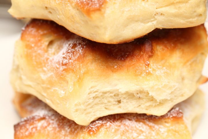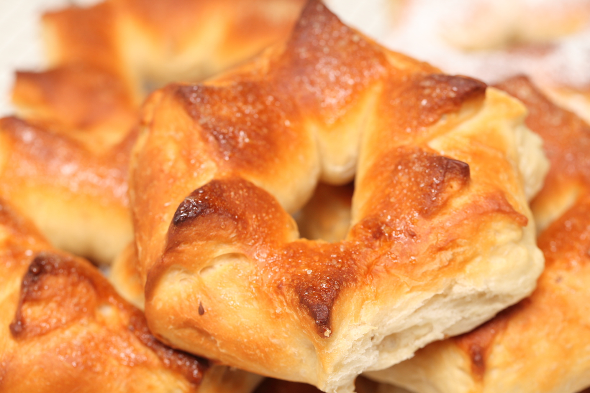 Making the star shapes is fun and really simple. Just a matter of a few cuts and turning the dough inside out. And children love to help you with the baking and eating. We press the starry dough in our homemade vanilla sugar, but you can of course choose to use cinnamon sugar or slivered almonds for example. You can also add things like raisins or cranberries to the dough. We like them ‘plain’ as other Christmas bakes already contain lots of fruits and nuts. A good dusting of powdered sugar, makes all bakes festive this season of course.
