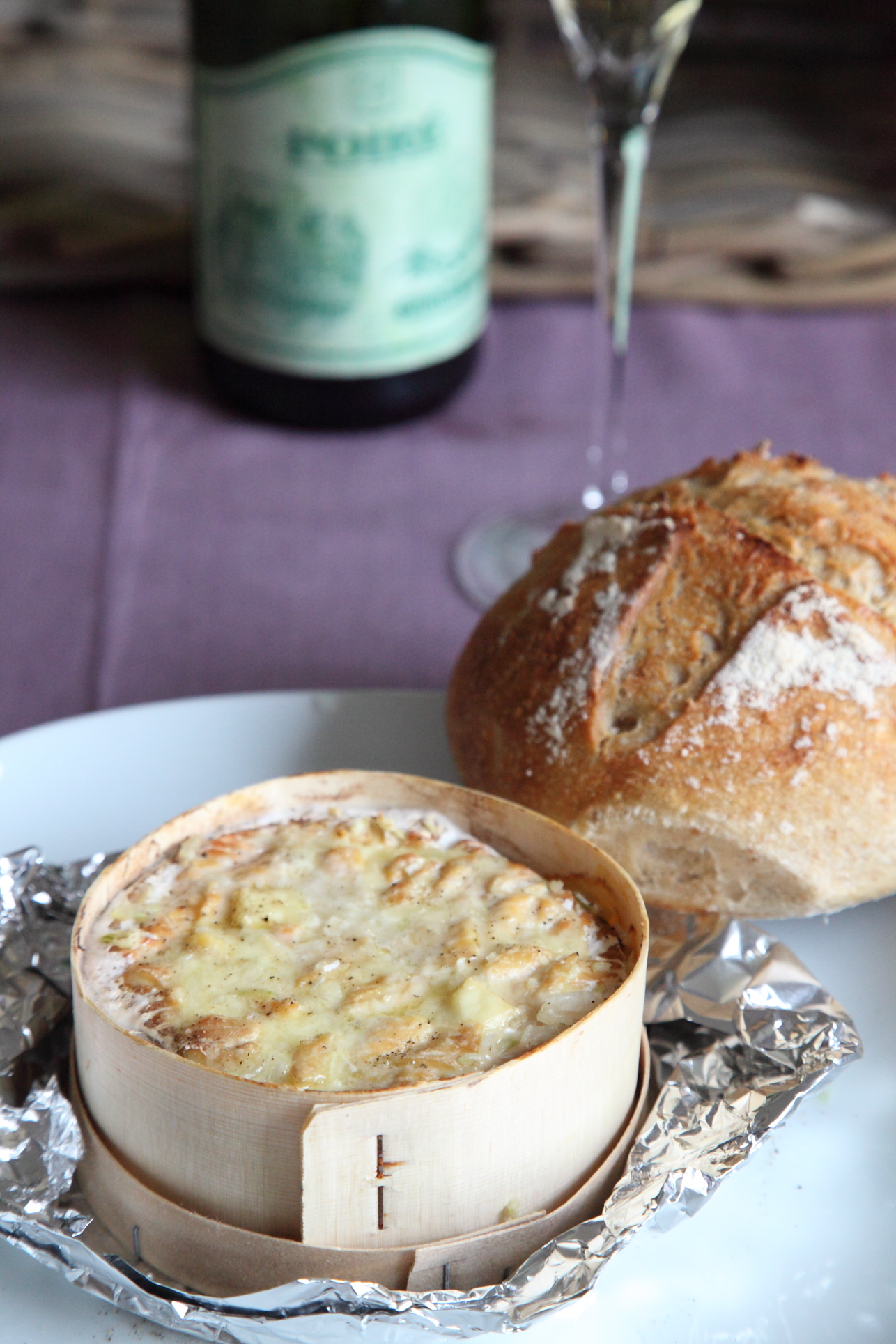 Another fine French Fondue option is a cheese called Vacherin Mont d’Or from the Jura region. This cheese is seasonal so it’s sold usually from September til May. Baked and hot from the oven this cheese is also an absolute delight. Try adding very finely chopped white onion and a splash of white wine (maybe also from the region) before you bake it. Pry the little onions in with your fingers, a bit messy but worth it. It’s great with either a glass of light white or red wine. We also like a fondue with a glass of cold pear cider (poiré). If you can’t find this cheese you can also opt for it’s close relative a Crémeux du Jura. The Mont d’Or and Jura need more time in the oven, somewhere between 25 and 30 minutes!