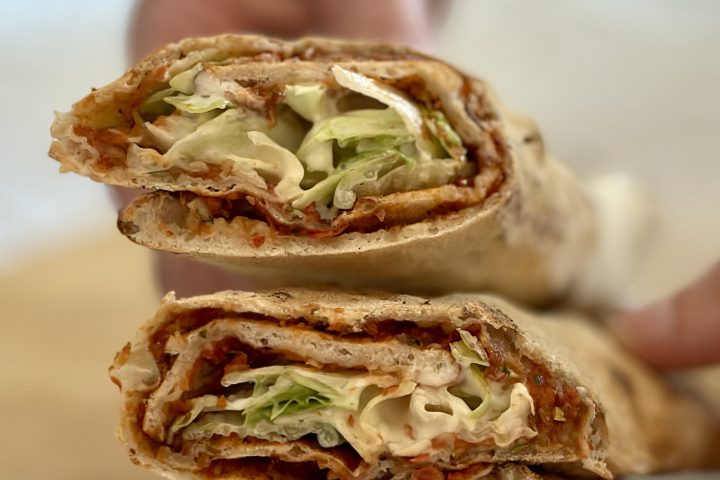 When the lahmacun comes out of the oven, you can add fresh ingredients like lettuce, pieces of cucumber and tomato and garlic sauce or hot sauce. We make a garlic sauce with black garlic paste, mayonnaise and yogurt, which combines really well with the other ingredients. Then we roll up the lahmacun, take it in our hands and take a bite.
