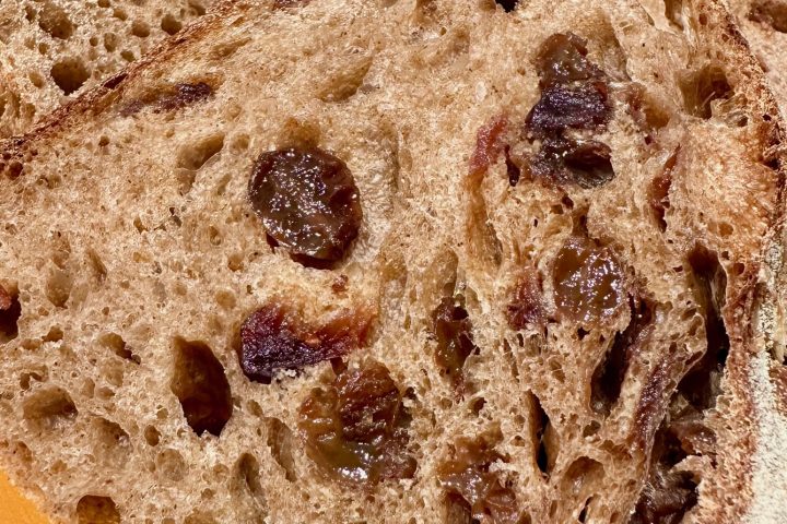 Add the soaked and drained raisins and cranberries, sprinkled with some flour to absorb excess moisture, to the dough and mix until well incorporated. With a mixer, this will take 1 minute; by hand, you’ll need to work them into the dough with your fingers, which will take a little longer.