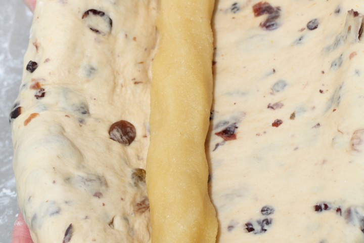 Neem nu een deegroller en rol het deeg uit. ter indicatie: Het deeg heeft nu een afmeting van ongeveer 35 x 20 tot 25 cm. Zorg ervoor dat de randen boven en onder een beetje dikker blijven ten opzichte van het midden. Maak een worst van de amandelspijs, een klein beetje korter dan de lengte van het brood en plaats deze in het midden. Vouw het deeg dubbel en zorg ervoor dat de dikkere randen tegen elkaar aan komen, de bovenste rand landt daarbij meer op het dunnere middengedeelte. Druk nu het deeg tussen de bult van de amandelspijs en de dikkere buitenrand stevig in. Leg het kerstbrood nu al meteen op de bakplaat die straks de oven in gaat, zodat je hem niet meer hoeft te verplaatsen of aan te raken.
