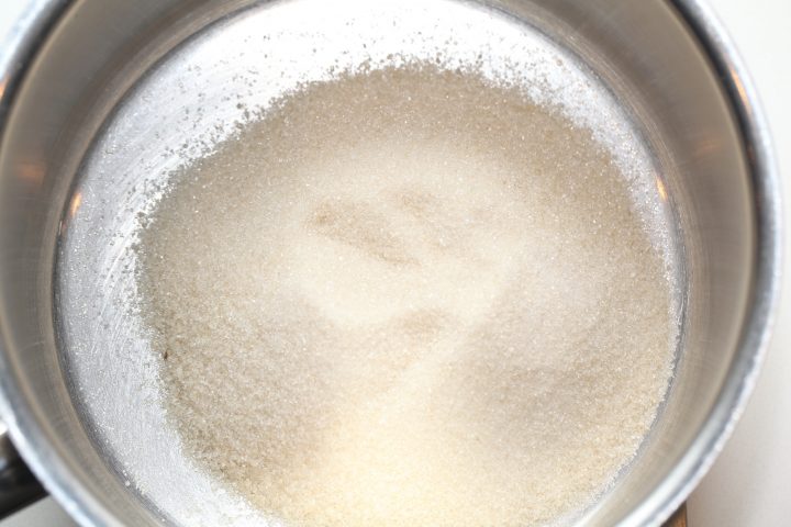 - Pour the sugar and water (from the tap or room temp is both OK) in a heavy-bottomed saucepan. Swirl the pan so all the sugar is coated by the water.