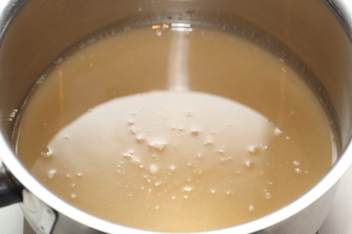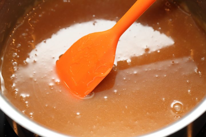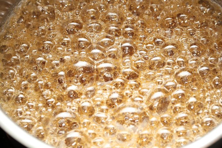 - Bring to a boil on medium to high heat WITHOUT STIRRING. If needed swirl the pan gently, but leave it alone for the most part. Stirring will cause crystallization (seizing) of the sugar!