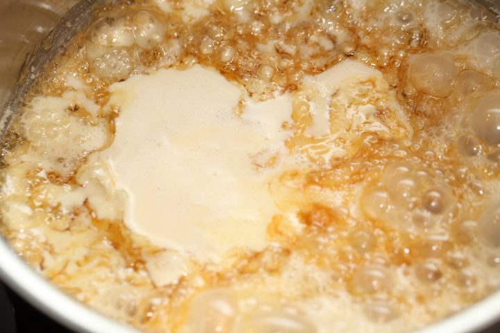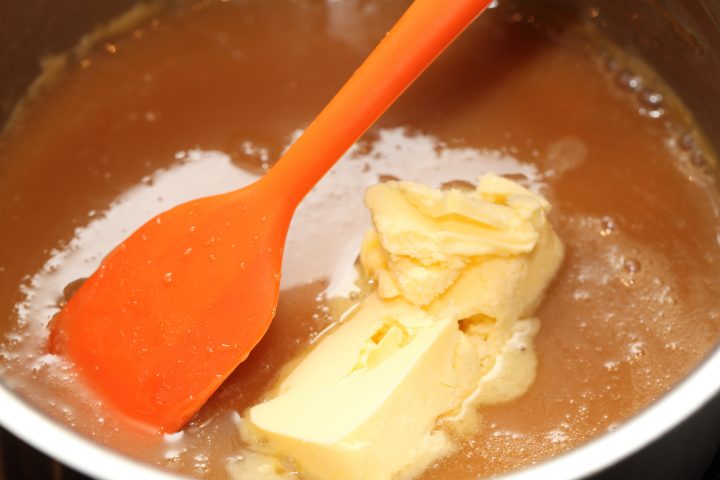 - Now add the 40 g of butter. At this stage you can stir the caramel (best with a spatula) to incorporate all the butter and make sure the sauce gets a silky consistency