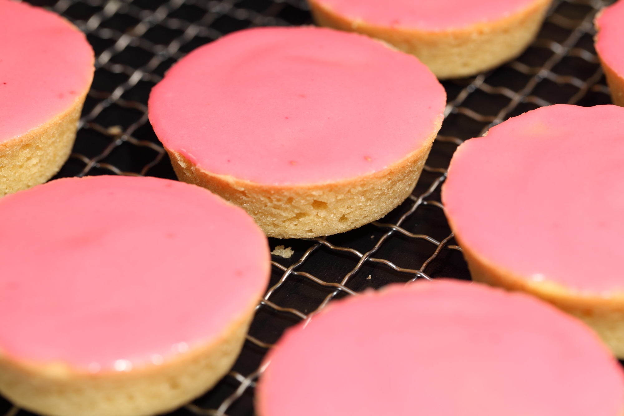 Wrijf de verse frambozen (de ontdooide diepvriesversie werkt hier ook prima) door een fijn zeef en zorg dat je alleen de puree over houdt. Meng de puree met het citroensap en voeg zoveel poedersuiker toe tot je een zeer stevig glazuur hebt dat slechts heel langzaam uitloopt. Je kunt indien nodig naast het citroensap nog wat water gebruiken om de juiste consistentie te bereiken. Breng het glazuur gelijkmatig op de afgekoelde koeken aan en laat stevig worden.