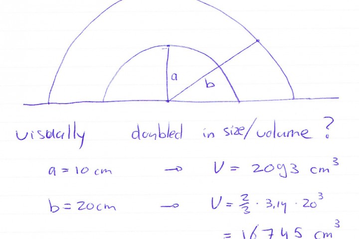 Another mind game. Take a nice lime (the fruit) and imagine it to grow. When will the lime be ‘doubled in size’? When it is the size of a mandarin, an orange, a grapefruit or a watermelon? It is hard to visualize when a round fruit is ‘doubled in size’ in comparison to another fruit.