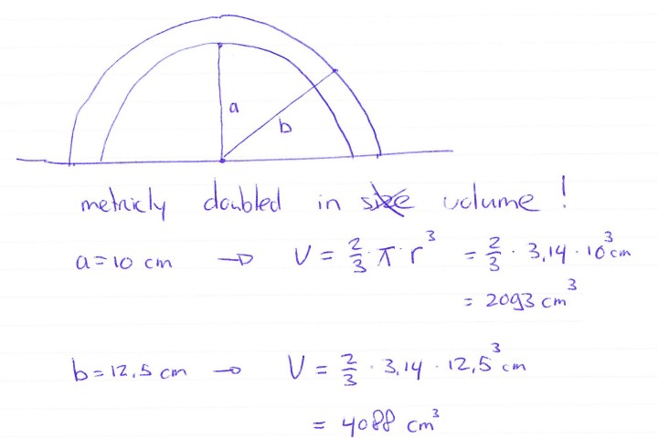 When you measure the height of the boule of dough you can use this height with the formula above as the height is mathematically the same as the radius because we have a halved sphere. For my calculations I start with an imaginary boule of dough with a height of 10cm. This gives us a boule of dough with the volume of 2093cm³ which is a little over 2 liters of dough. When you take a boule with a height of 20cm this equals about 16745cm³ which is about 16 liters of dough! So a doubling in diameter equals 8 times the growth in actual volume.