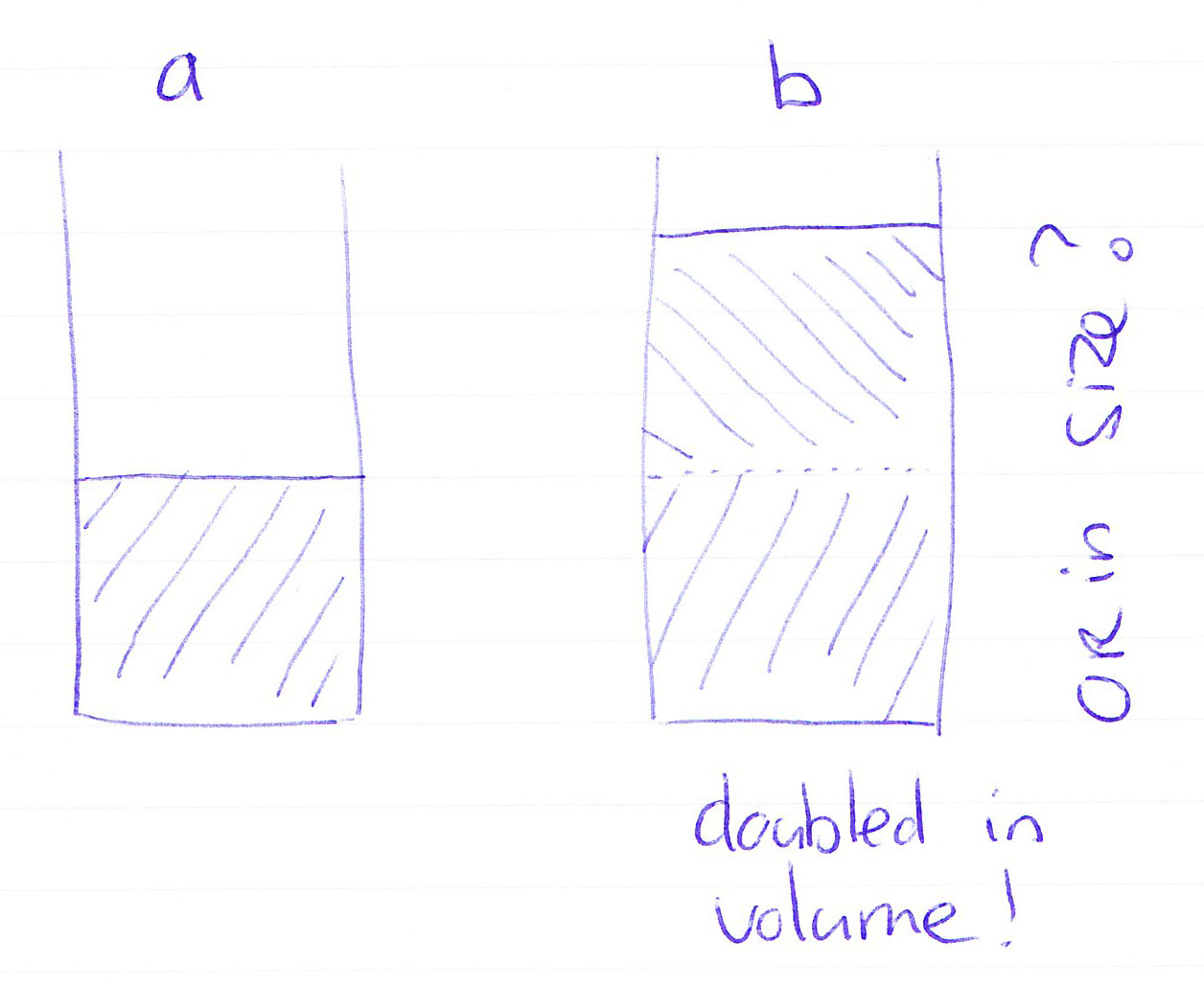 Imagine a measurement cylinder filled with a piece of dough. When you let the yeast do its job this little piece of dough will grow inside the cylinder. As for the dough the only way is up it will slowly fill the cylinder and it is really simple to see when the dough has doubled in volume. It will be when you read twice the number on the measurement cylinder compared to when you started! What has doubled in this experiment is the volume.