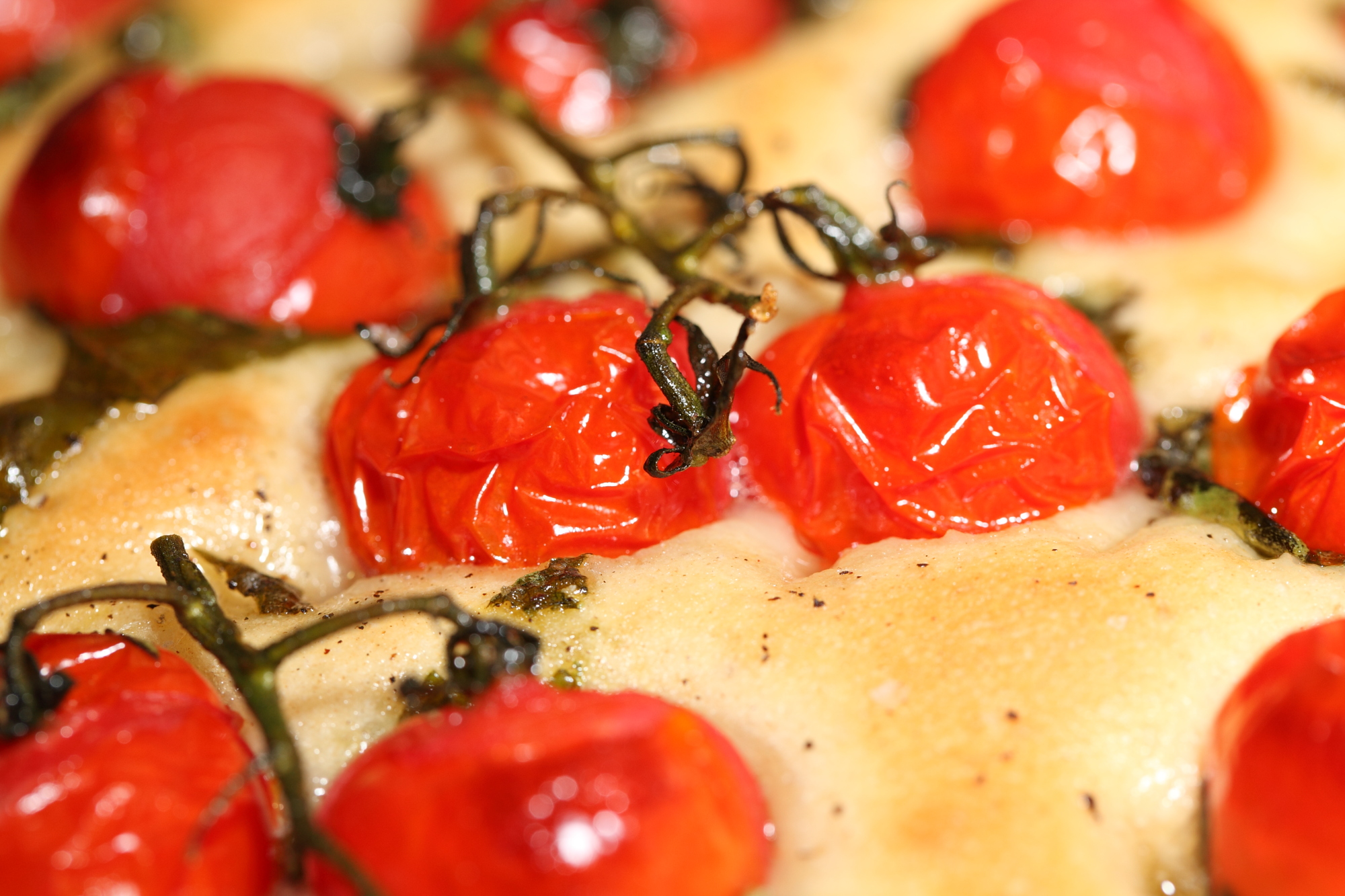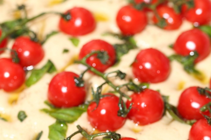 Put the oil with basil leaves on top of the dough and with your finger tips make holes in the dough and spread the oil, making sure the oil also drips in the holes. Put the tomatoes on top and also press them into the dough.
