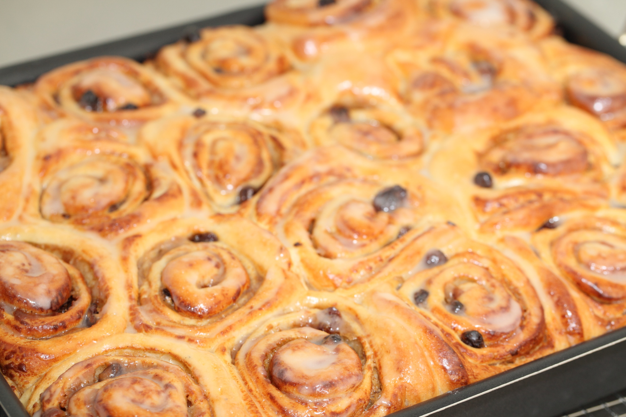 Rol met een deegroller het deeg uit tot een rechthoek van ongeveer 60 x 50 cm. Neem de voorbereide kaneel-banketbakkersroom uit de koelkast en klop even los met een garde. Verdeel de room gelijkmatig over het deeg. Bestrooi met de rozijnen en bruine suiker. Rol het deeg op vanaf de langste zijde en snijd het in 2,5 cm rolletjes. Leg de broodjes in een ingevette bakvorm (degene die we gebruiken op de foto is 30 x 40 cm). Laat de kaneelbroodjes 60 tot 75 minuten rijzen (Heb geen haast, laat het echt goed rijzen: zie foto beneden als laatste in de galerij om te zien hoe het gerezen deeg er uitziet).