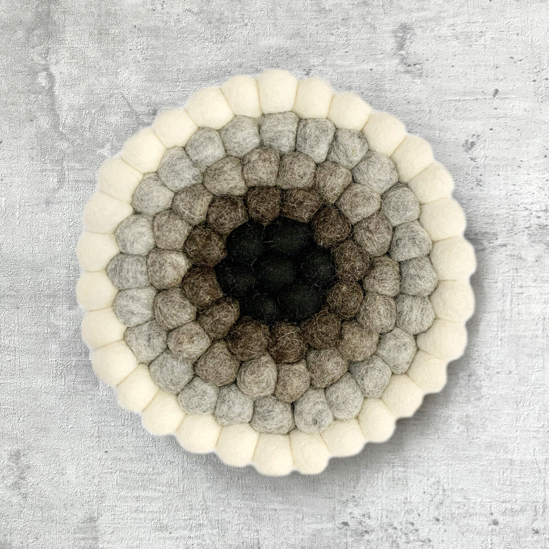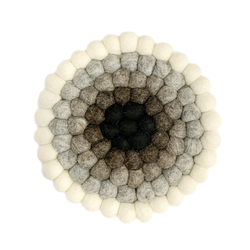 Beautiful quality, thick coaster made from felt balls. 100% pure wool. Practical for under a hot pan or baking tin or decorative on the table, under a vase or even on the wall. These neutral colors, from winter white to nearly black, will go with almost anything.