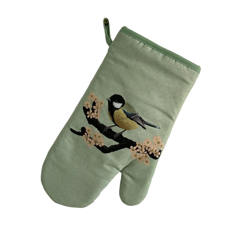 Myrte ontwerpt prachtige illustraties, zoals de charmante koolmees op deze ovenwant, met met lentegroene achtergrond. Gemaakt van biologisch katoen.