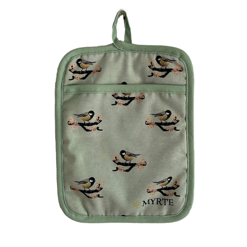 Myrte ontwerpt prachtige illustraties, zoals de koolmees op deze pannenlap, met prachtige kleuren op een lente-groene achtergrond. Gemaakt van hoogwaardig biologisch katoen.