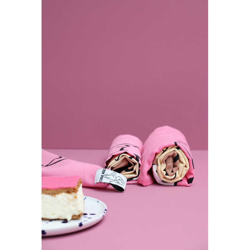 Onmiddellijk herken je de zoete roze en gele kleurtjes van de lekkere tompouce in deze handdoek.
